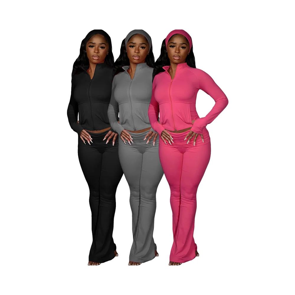 European American Women's Micro Horn Yoga Two-Piece Top-Flip Waist Suit with Long Length Headscarf Casual Solid Style HR25088